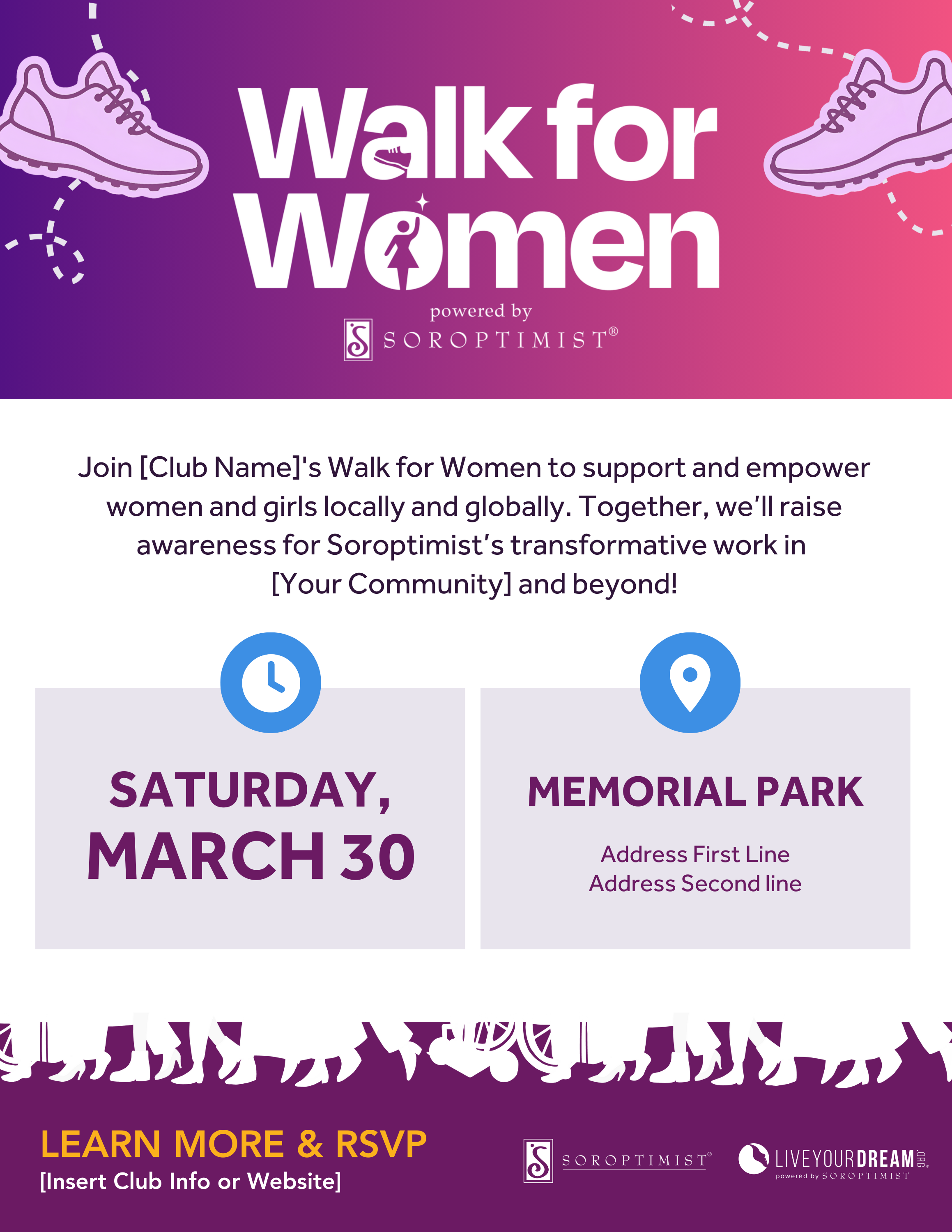 날짜]에 [장소]에서 열리는 [클럽명]의 여성을 위한 걷기 행사에 여러분을 초대하게 되어 매우 기쁩니다. 이 특별한 이벤트는 여성 역사의 달을 기념하며 여성과 소녀들이 꿈을 이룰 수 있도록 힘을 실어주는 소롭티미스트의 이니셔티브의 일환입니다.